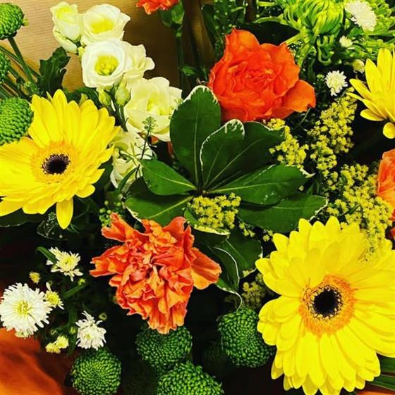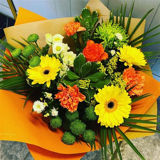 A bright and uplifting arrangement filled with warm yellows, glowing oranges and fresh greens. Created by hand at Blooming Mad using fresh seasonal flowers, this cheerful design is available for local delivery in Coleford and surrounding areas, delivered by hand for the personal touch.