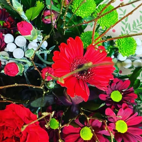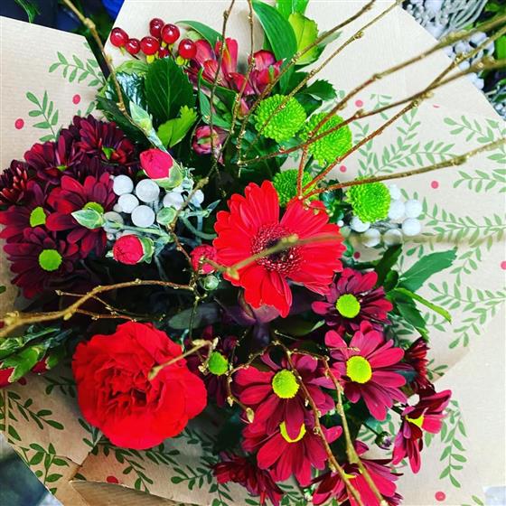 A rich seasonal mix bursting with deep reds, bright berries, winter foliage and festive highlights. Freshly arranged by Blooming Mad for Christmas gifting and hand-delivered locally across Coleford.