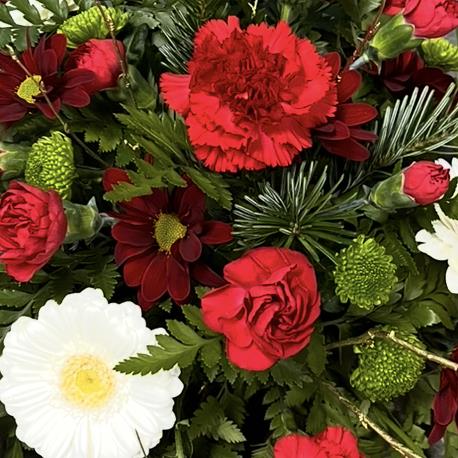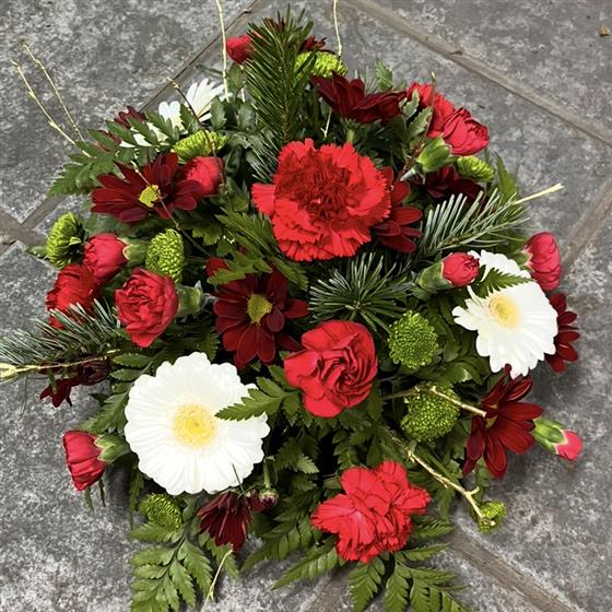 A heartfelt Christmas grave posy arranged with fresh red, white and deep burgundy flowers, seasonal evergreens touches. Created by Blooming Mad and delivered locally by hand.