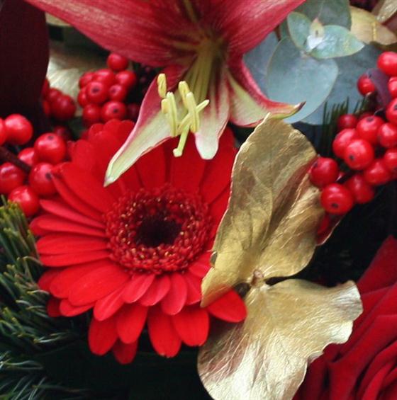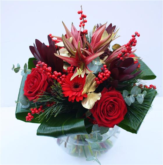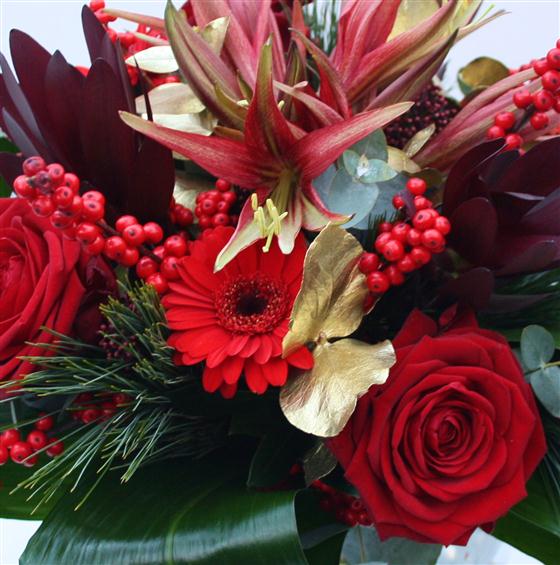 A textured display of deep red roses, lilies, gerberas and berries skirted with folded aspidistra leaves.