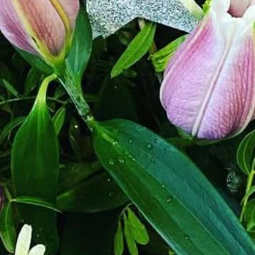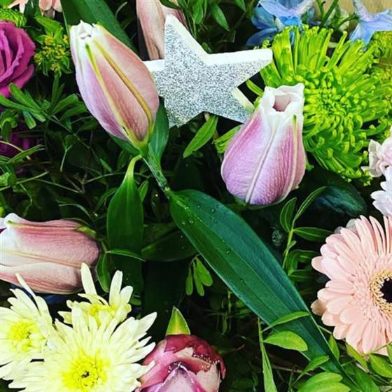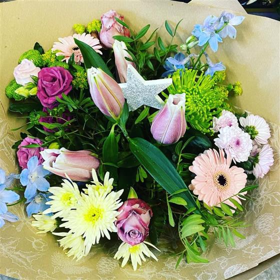 A soft and elegant mix of lilac, blush, cream and cool seasonal greens, finished with a festive silver star for a gentle Christmas touch. Handcrafted by Blooming Mad and delivered locally by hand.
