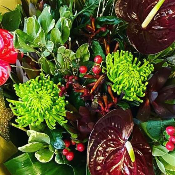 A rich seasonal mix in glowing reds and vibrant greens, finished with festive sparkle and lush winter foliage. A bold Christmas arrangement handcrafted at Blooming Mad and delivered locally by hand.